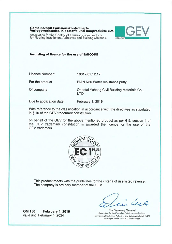 壁安抗堿(jian)防霉型N30耐水膩子通過歐洲(zhou)建材(cai)環保性能(neng)權威認證(zheng)機構(gou)——德(de)國GEV建立的(de)EMICODE分級體系最高(gao)標準,獲(huo)得EC1PLUS證(zheng)書,該產品可最大(da)限度保證(zheng)居(ju)住環境的(de)空氣質量。