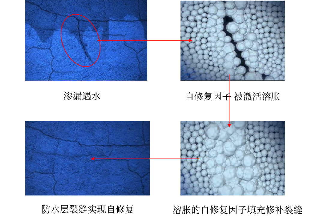 當防水(shui)涂膜出現微小裂紋或損傷后,涂料中自修復因(yin)子遇水(shui)激活,膨脹(zhang)成凝膠(jiao)狀,并(bing)在水(shui)化作(zuo)用下(xia),形成堅硬的化合物填補裂縫,有效防止反復滲漏,降低維修成本(ben)。