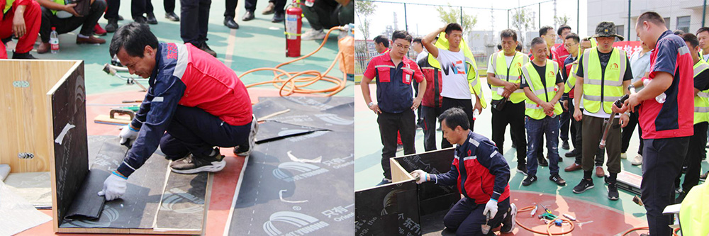 雨(yu)虹(hong)學院高級(ji)培訓師張廣(guang)輝(hui)、2019“聯盟杯(bei)”全國建筑防(fang)水(shui)行業職業技能大賽(sai)-防(fang)水(shui)涂料項目冠軍洪存峰等為(wei)合伙(huo)人現場演示(shi)瀝(li)青防(fang)水(shui)卷(juan)材、高分子防(fang)水(shui)卷(juan)材、防(fang)水(shui)涂料等產品(pin)的標準(zhun)化施工工藝。