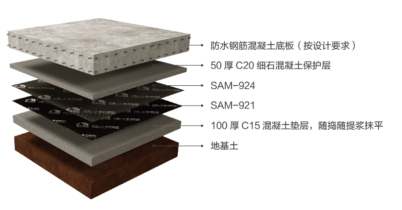 SAM-924纖維增(zeng)強型高分子膜基自粘瀝青防(fang)水卷材常見的防(fang)水系(xi)統方案(an)包(bao)括: