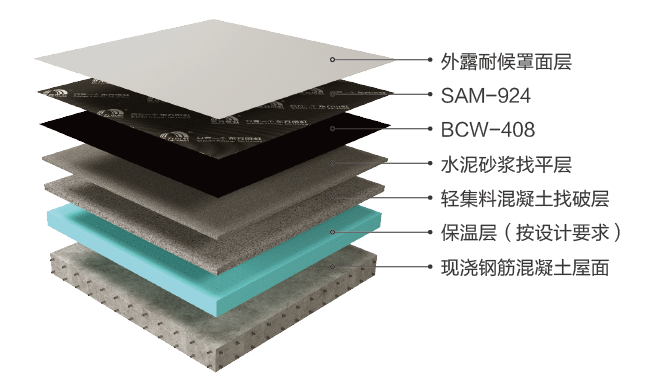 外露耐候罩面(mian)層材(cai)料推薦:HCA-108 屋(wu)面(mian)丙烯(xi)酸高彈防(fang)水涂料;HCA-200 建筑反射隔熱涂料;GES-W308 外露型(xing)水性聚氨酯防(fang)水涂料