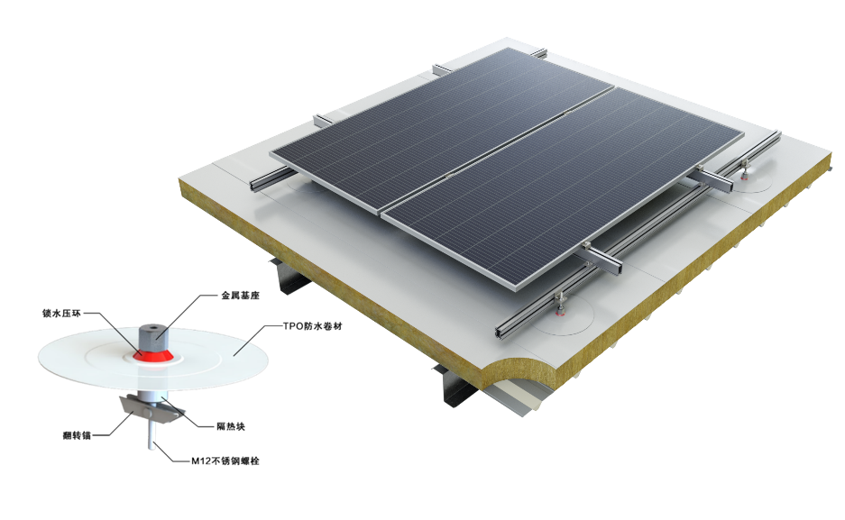 系統(tong)可(ke)適配(pei)虹昇輕(qing)量(liang)化(hua)光(guang)(guang)(guang)伏(fu)基座(zuo),利用(yong)輕(qing)量(liang)化(hua)光(guang)(guang)(guang)伏(fu)基座(zuo)為分布式光(guang)(guang)(guang)伏(fu)提供(gong)安裝支點(dian),基座(zuo)下部通過翻轉(zhuan)錨與(yu)(yu)鋼板(ban)固定,上部金屬件與(yu)(yu)TPO卷材(cai)在工(gong)廠預制成型(xing)直接(jie)與(yu)(yu)既有(you)柔性卷材(cai)進行焊(han)接(jie)。光(guang)(guang)(guang)伏(fu)基座(zuo)與(yu)(yu)鋼板(ban)連接(jie)牢(lao)固同時確保(bao)節(jie)點(dian)處的防(fang)水效果,有(you)利于后期(qi)(qi)屋面光(guang)(guang)(guang)伏(fu)電(dian)站的長期(qi)(qi)穩定運行。