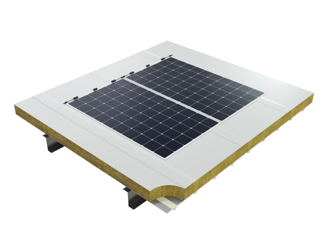 相較于普通機械固定單層屋面系統,SWIFT輕快集成柔性屋面采用特殊工藝巖棉,容重120kg/m³的前提下即可滿足JGJ/T 316《單層防水卷材屋面工程技術規程》對巖棉保溫材料的性能指標要求(60kPa的壓縮強度下,壓縮比不應大于10%,500N的點荷載作用下,變形量不應大于5mm)*。底板采用WISKIND優質鍍鋅鋼板,厚度0.6mm制成波高35mm,板寬100mm的壓型鋼板。降低整個屋面系統荷載,為屋面分布式光伏電站安裝預留更多空間*。